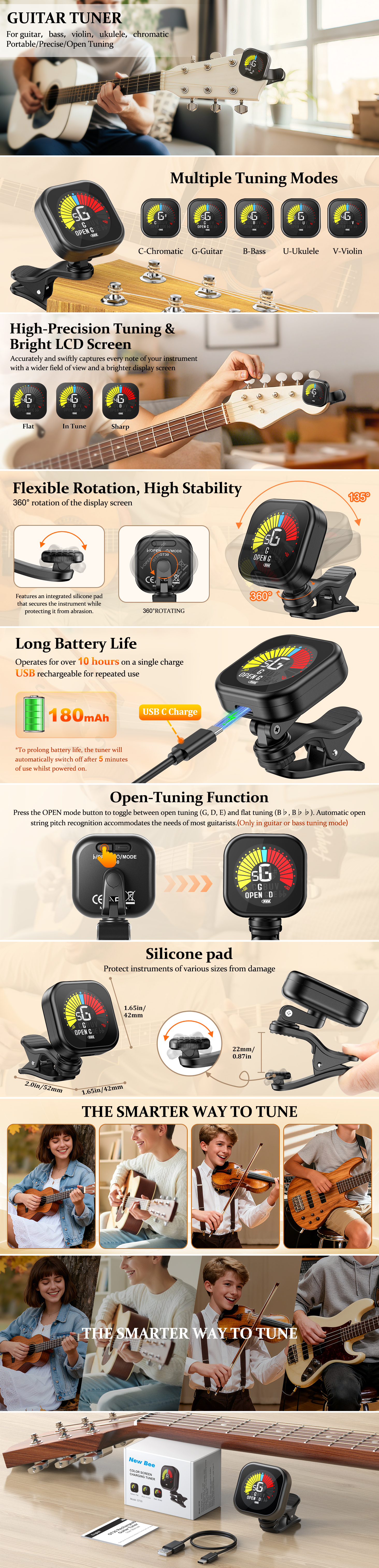 Forget the hassle of disposable batteries. Equipped with a built-in lithium-ion battery, this tuner provides up to 10 hours of continuous use on a single charge. The modern USB-C charging port ensures universal compatibility, so you can power up quickly between sets or during practice sessions.