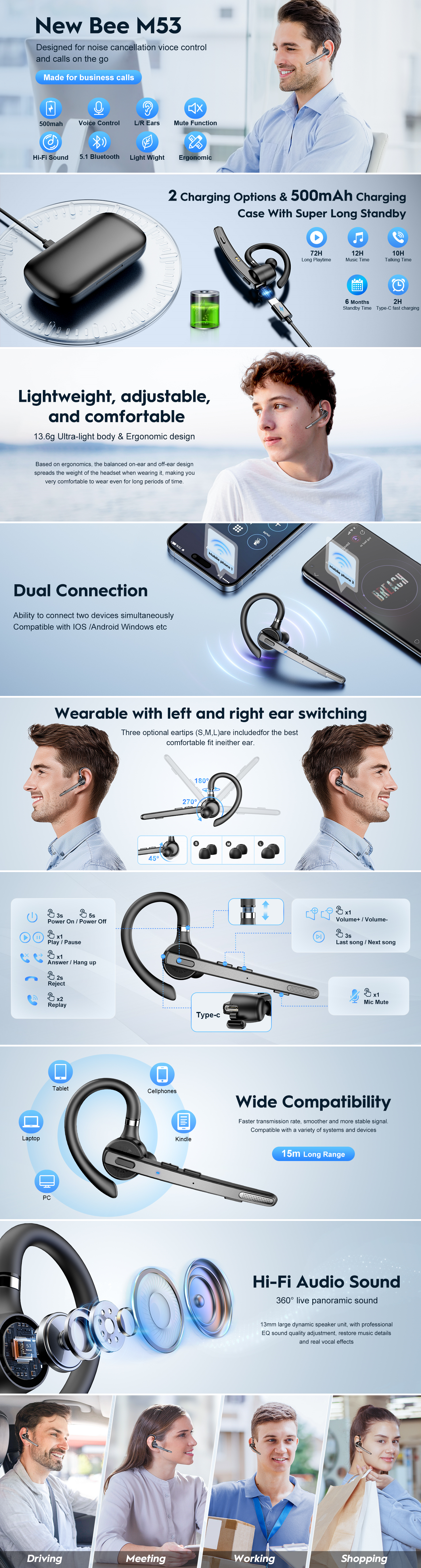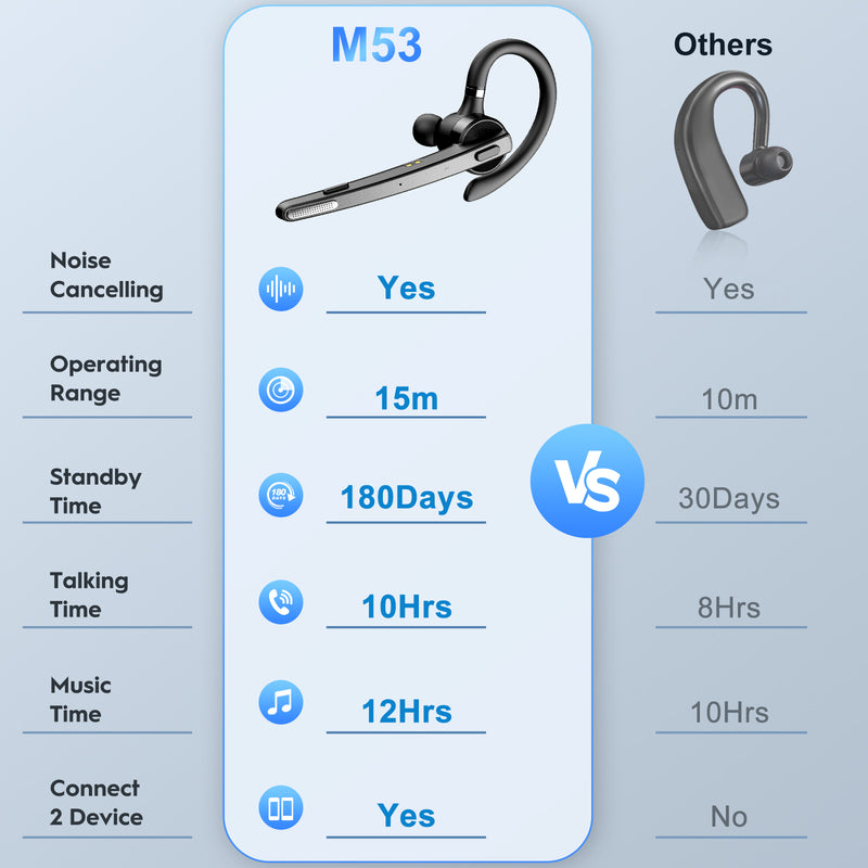 Designed for those who wear their headset all day, the M53 weighs only 13.6 grams. The ergonomic architecture includes a 180° swiveling ear hook and a 270° rotating arm, allowing for a custom fit on either the left or right ear. With three sizes of soft ear tips included, you can enjoy a secure, pressure-free experience from your first call to your last.