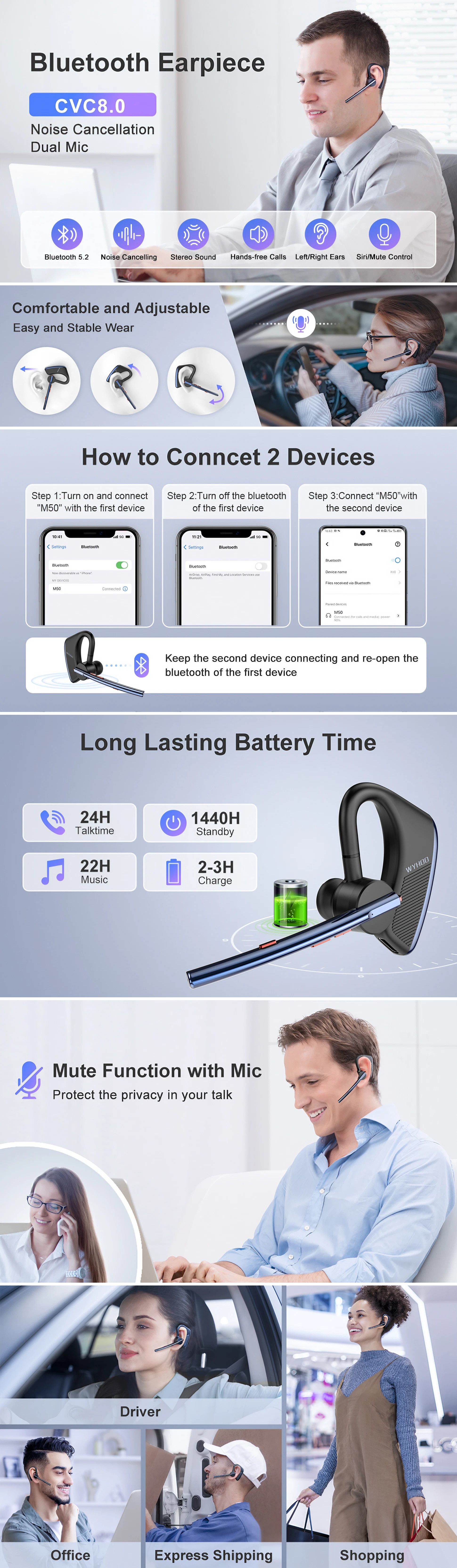 At a mere 16 grams, the M50 is designed for long-term wear without fatigue. The flexible microphone and 360° rotating ear hook allow for a customized, secure fit on either the left or right ear. Accompanied by three sizes of soft silicone tips, the headset stays perfectly in place, providing a "barely there" feel throughout your workday.