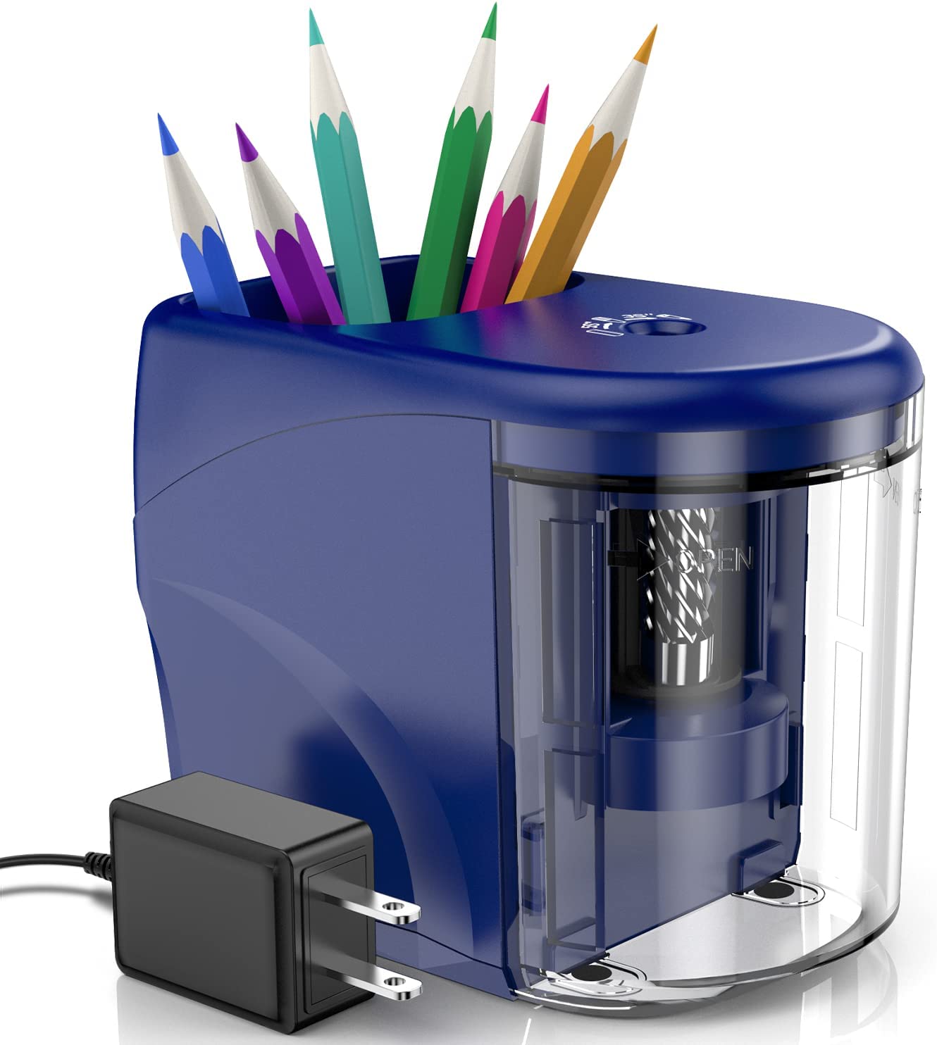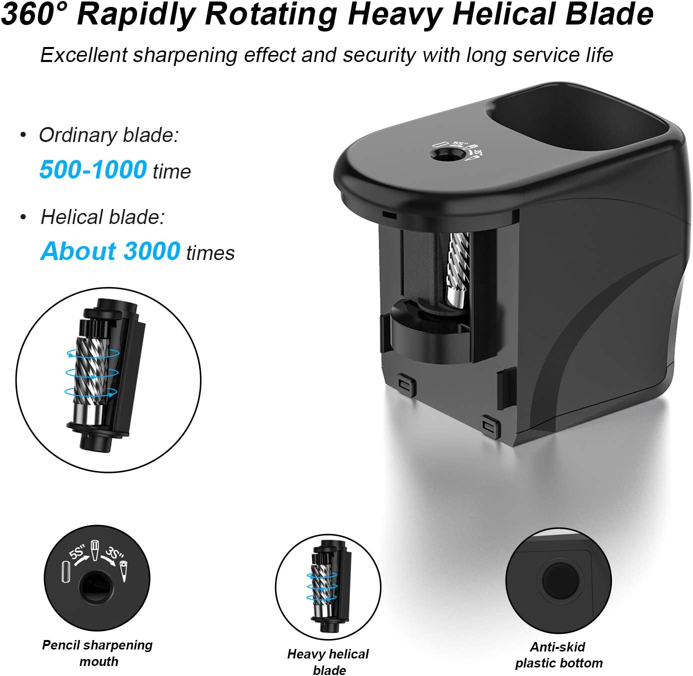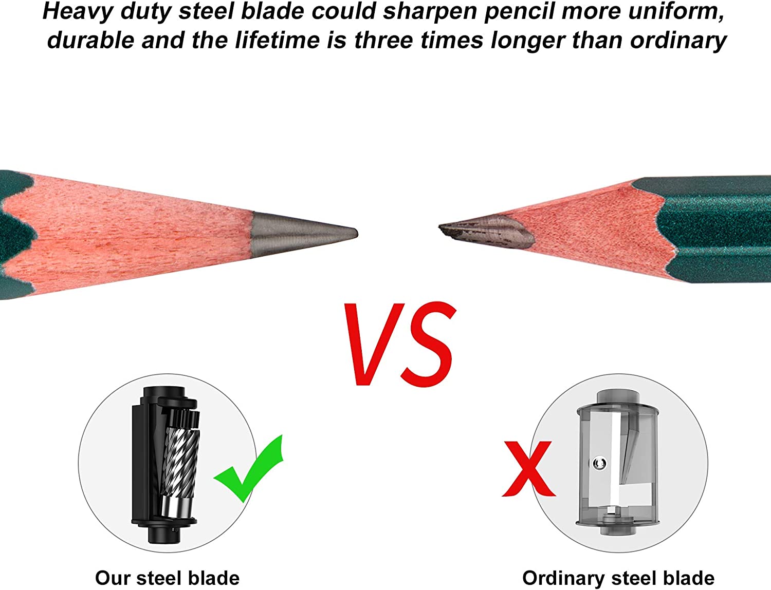- [Heavy Duty Steel Blade] 360°fast sharpener and powerful heavy duty steel blade could sharpen your pencil over 3,000 times, besides, there are 3 different sharpness options(Sharp/ Medium/ Blunt) can be choose. Perfect for teachers, students, engineers, children, artists, and anyone who loves to draw!