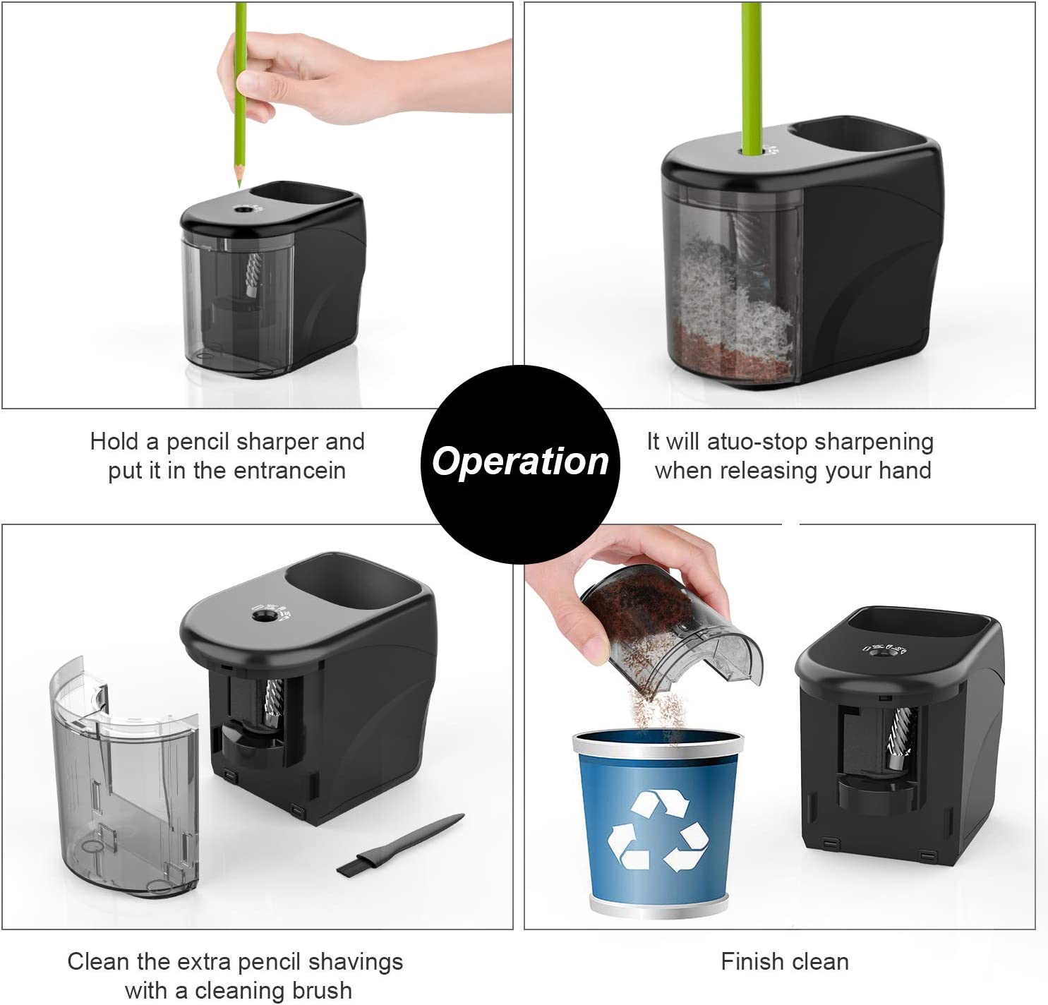 - [Automatic Features] Automatic pencil sharpener suit for No.2 Pencils (6-8mm) it will Auto-stop when the pencil is sharpened to a perfect and durable point, 3-5 seconds fast sharpening can prevent your pencil be eaten