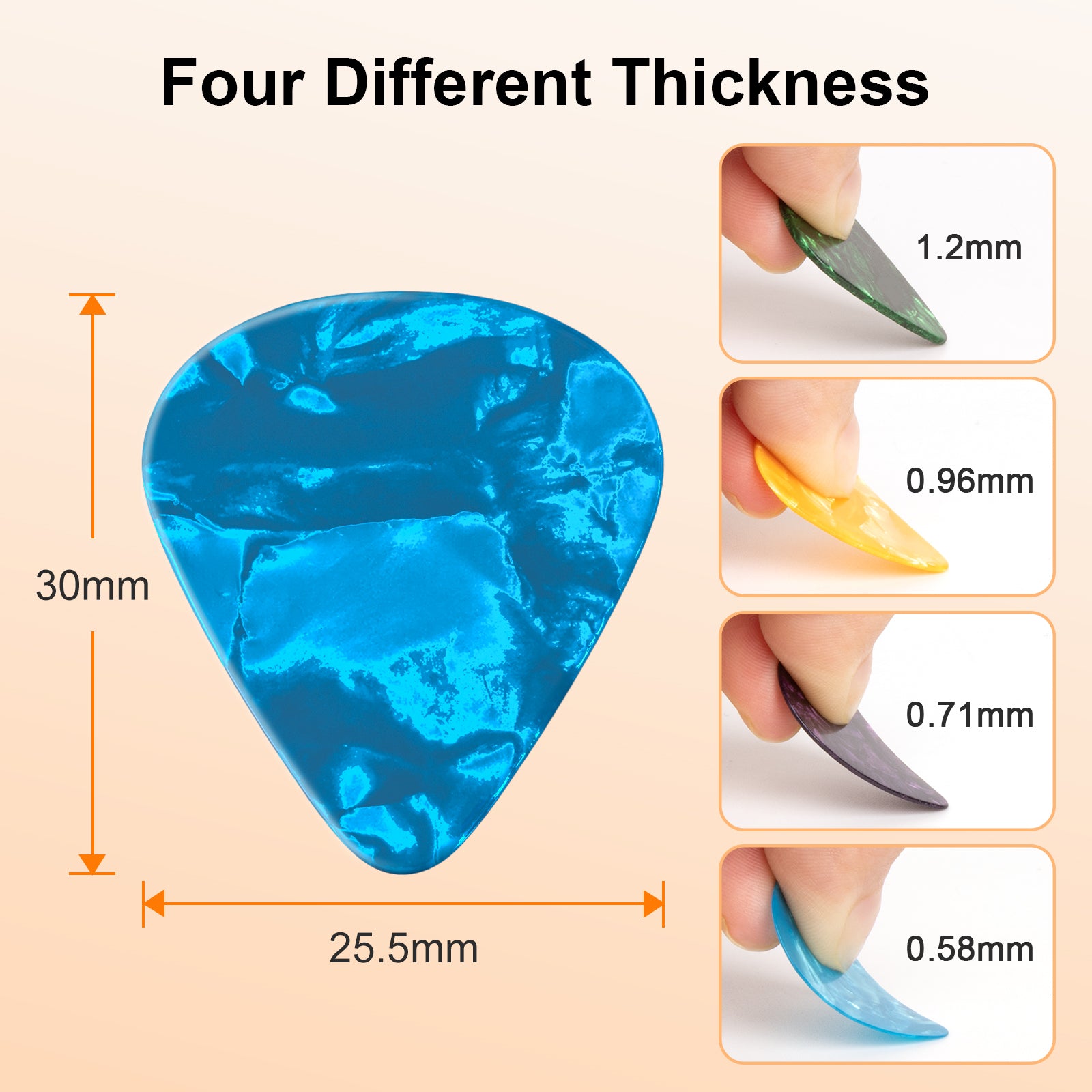 Explore a full spectrum of musical expression with our curated 16-piece collection. Featuring four distinct thicknesses—Thin (0.58mm), Medium (0.71mm), Heavy (0.96mm), and Extra Heavy (1.2mm)—this set allows you to transition effortlessly between delicate acoustic strumming and aggressive electric leads. It is the ultimate toolkit for finding your signature sound across any genre.